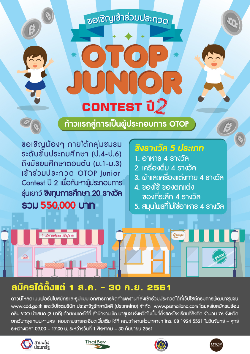 เชิญร่วมประกวด OTOP JUNIOR CONTEST ปี 2 ชิงทุนการศึกษา 20 รางวัล รวม 550,000 บาท 27 สิงหาคม 61 / 16.13 น. (Visited 1 times, 1 visits today)Facebook iconFacebookTwitter iconTwitterLINE iconLine