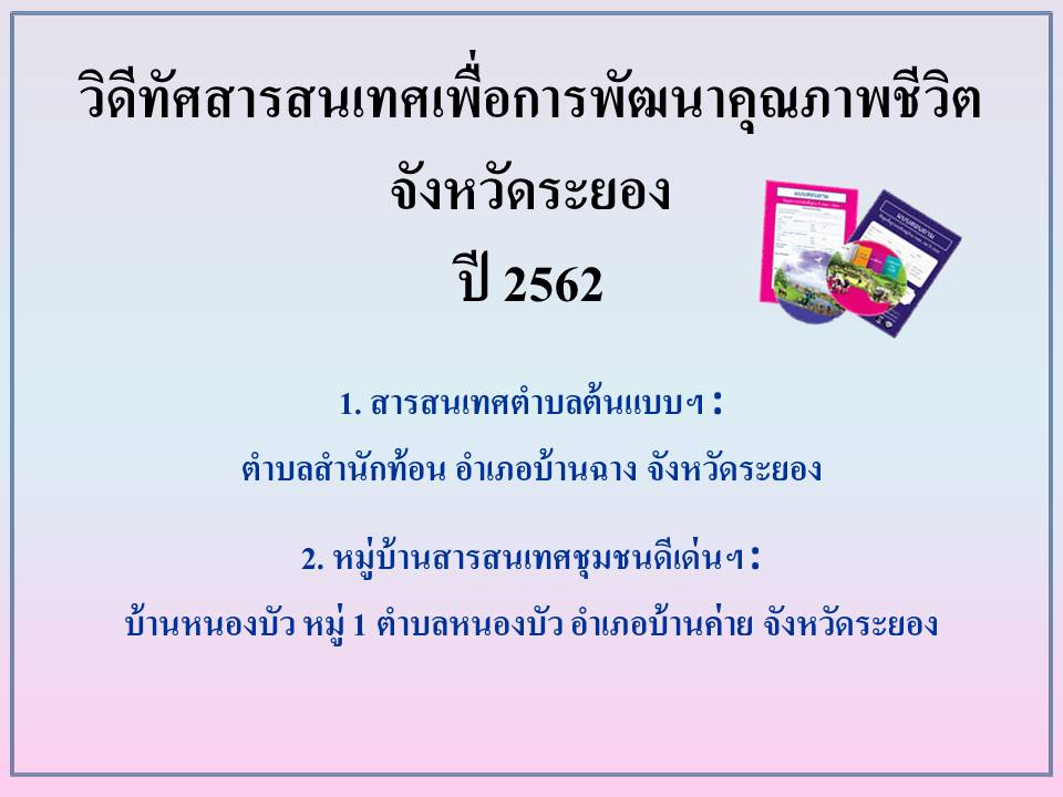 1. สารสนเทศตำบลต้นแบบเพื่อการพัฒนาคุณภาพชีวิต ตำบลสำนักท้อน อำเภอบ้านฉาง จังหวัดระยอง…ได้ที่ลิงค์