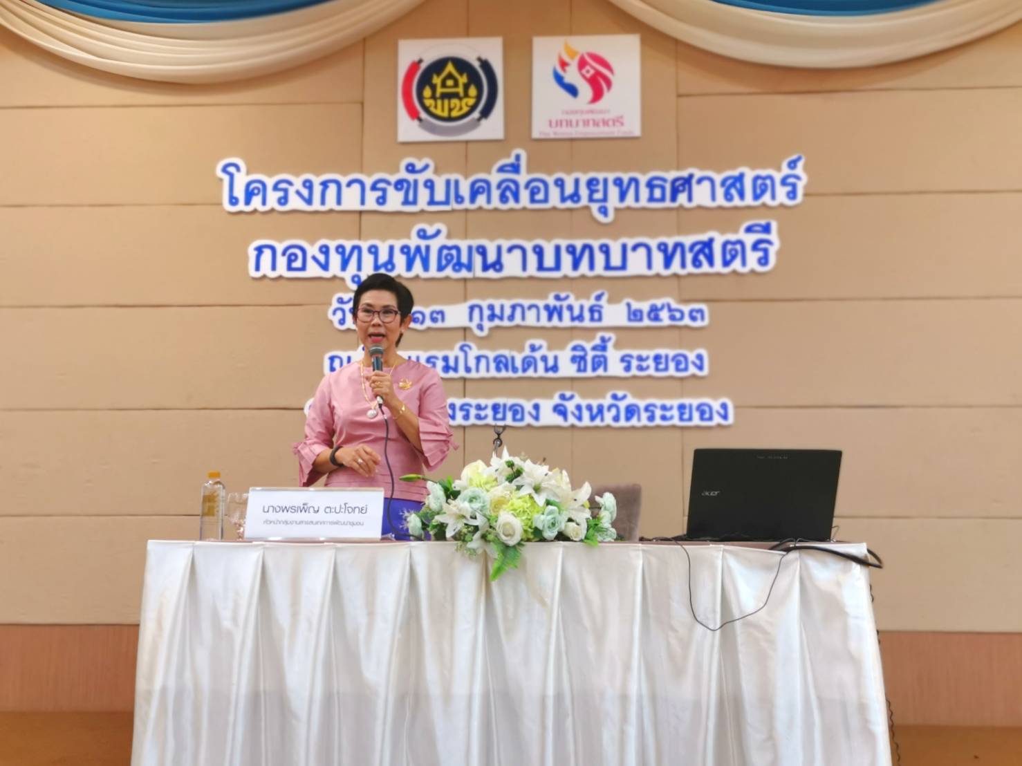 >> นางพรเพ็ญ ตะปะโจทย์ รกท.พัฒนาการจังหวัดระยอง ได้เข้ามาร่วมเป็นเกียรติโครงการขับเคลื่อนยุทธศาสตร์กองทุนพัฒนาบทบาทสตรี ซึ่งมีวัตถุประสงค์เพื่อให้กลไกขับเคลื่อนกองทุนพัฒนาบทบาทสตรี สมาชิกกองทุนพัฒนาบทบาทสตรี มีความรู้ความเข้าใจยุทธศาสตร์กองทุนพัฒนาบทบาทสตรี พ.ศ. 2563-2564 แนวทางการขับเคลื่อนการดำเนินงานกองทุนฯ ปี 2563 ซึ่งผู้เข้าร่วมโครงการฯ ประกอบด้วย สมาชิกประเภทองค์กรสตรี เจ้าหน้าที่พัฒนาชุมชน และพนักงานกองทุนพัฒนาบทบาทสตรี จำนวน 150 คน