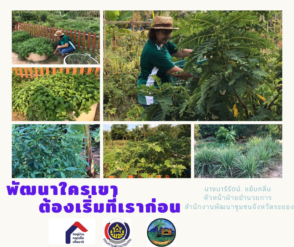 นางนารีรัตน์ แย้มกลิ่น หัวหน้าฝ่ายอำนวยการ สำนักงานพัฒนาชุมชนจังหวัดระยอง ขับเคลื่อนตามแผนปฏิบัติการ Quick win 90 วัน เพื่อสร้างความมั่นคงทางอาหาร โดยปลูกพืชผักสวนครัว เพื่อการบริโภคในครัวเรือน เป็นการสร้างภูมิคุ้มกันให้แก่ตนเองและครอบครัว จนเกิดแหล่งอาหารที่มีความสมบูรณ์ มีอากาศที่ดี มีสิ่งแวดล้อมภายในครัวเรือนที่น่าอยู่น่าอาศัย เกิดรายได้สู่ครัวเรือน