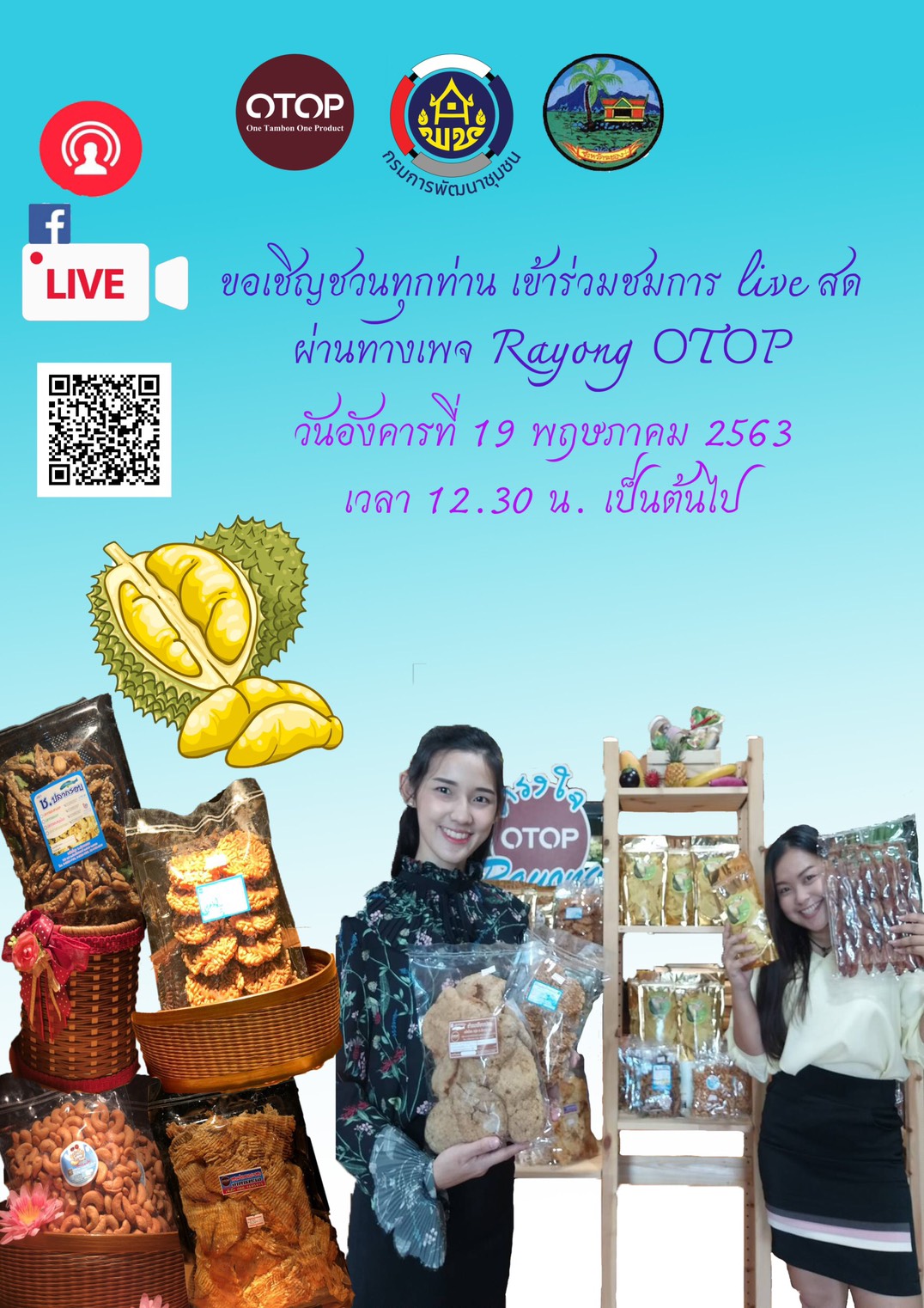 มาแล้วจ้าาาาาาาาทุกท่าน …วันพรุ่งนี้ วันอังคารที่ 19 พฤษภาคม 2563 เวลา 12.30 น. … พบกับ การ Live สด แนะนำสินค้า OTOP ระยอง