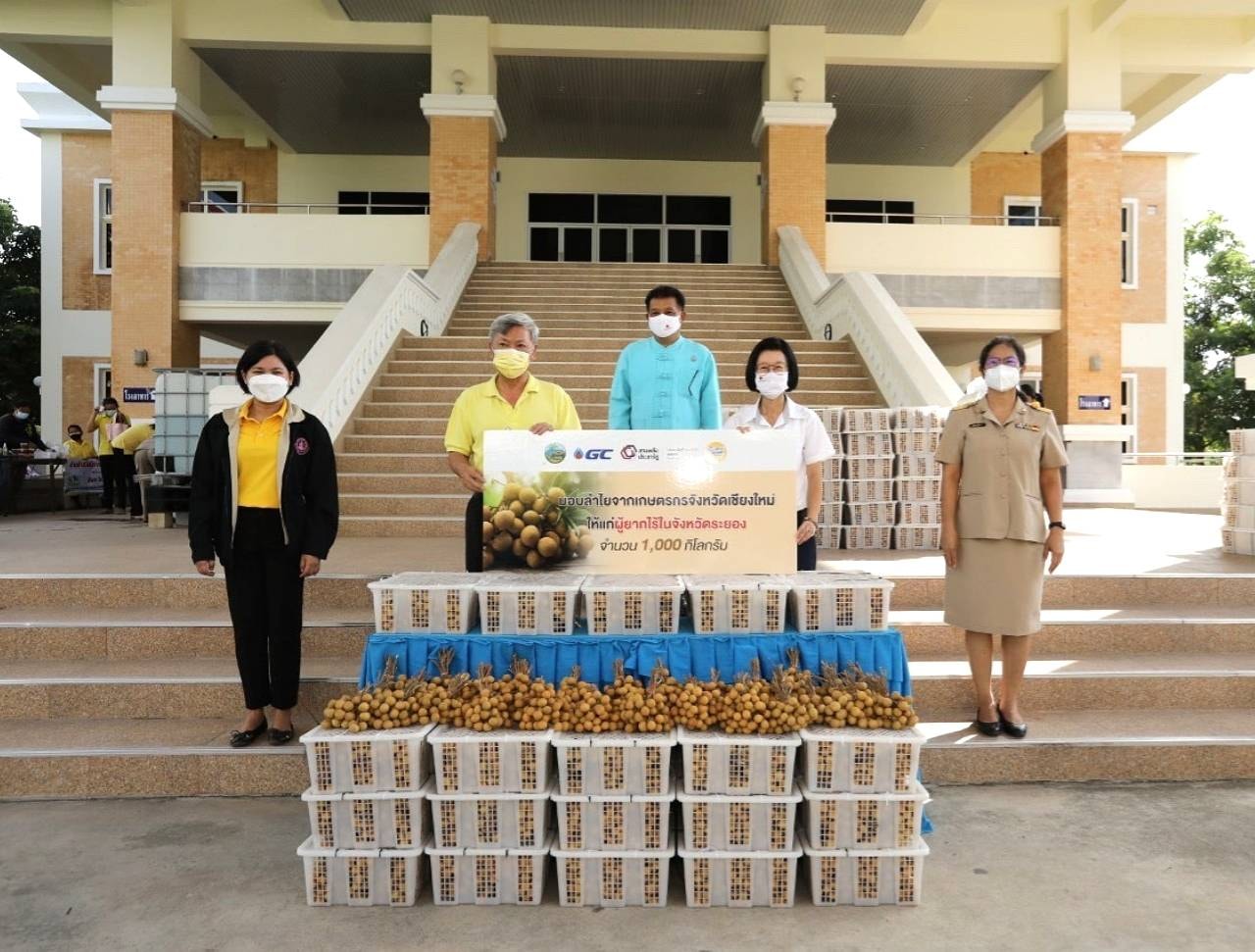 ?นายชาญนะ เอี่ยมแสง ผู้ว่าราชการจังหวัดระยอง เป็นประธานในพิธีส่งมอบลำไย จำนวน 1,000 กิโลกรัม ซึ่งบริษัท พีทีที โกลบอล เคมิคอลล์ จำกัด (มหาชน) และบริษัทประชารัฐรักสามัคคีระยอง (วิสาหกิจเพื่อสังคม) จำกัด โดยคุณเชาวนี พันธุ์พฤกษ์ เป็นผู้แทนจัดซื้อผ่านสำนักงานพาณิชย์จังหวัดระยอง เพื่อช่วยเหลือเกษตรกรสวนลำไยจากจังหวัดเชียงใหม่ นำไปมอบให้ผู้ยากไร้และกลุ่มเปราะบางในจังหวัดระยอง ทั้งนี้ได้มอบผ่าน 2 หน่วยงาน คือ สำนักงานพัฒนาชุมชนจังหวัดระยอง จำนวน 500 กิโลกรัม นำไปมอบให้ครัวเรือนยากจนที่ได้รับผลกระทบจากสถานการณ์การแพร่ระบาดของโรคติดเชื้อไวรัสโคโรนา 2019 (COVID-19) และสำนักงานพัฒนาสังคมและความมั่นคงของมนุษย์จังหวัดระยอง นำไปมอบให้แก่ครัวเรือนกลุ่มคนเปราะบาง จำนวน 500 กิโลกรัม ภายใต้คอนเซฟ “ร่วมสร้างรอยยิ้มให้เกษตรกรผู้ปลูกลำไยและผู้ยากไร้ในจังหวัดระยอง เปลี่ยนขวดพลาสติก PET เป็นลำไย มอบให้ผู้ยากไร้” กิจกรรมดังกล่าวได้เชิญชวนหน่วยงานราชการต่าง ๆ และประชาชนทั่วไปร่วมนำขวดพลาสติก PET มาหย่อนที่จุดไดรฟ์ทรู เพื่อเปลี่ยนขวดพลาสติก PET เป็นลำไยมอบให้ผู้ยากไร้ “10 ขวด PET เปลี่ยนเป็นลำไยมอบแก่ผู้ยากไร้ 1 กิโลกรัม”