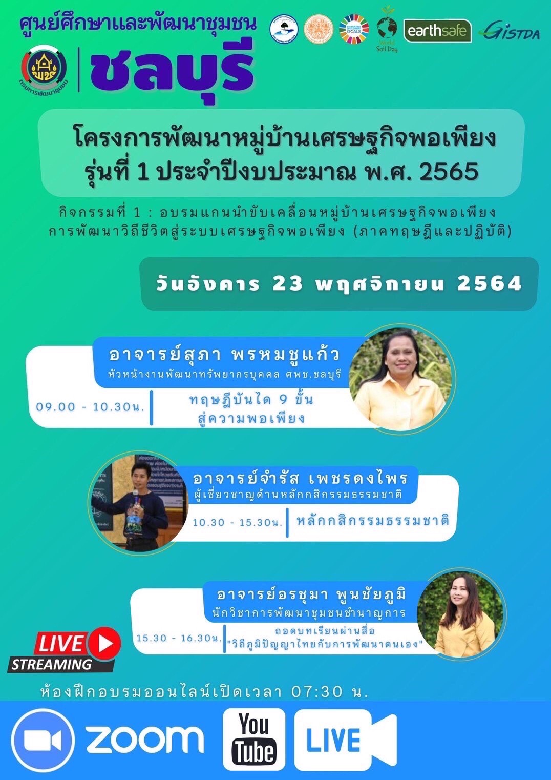 ?? วันอังคารที่ 23 พฤศจิกายน 2564 (วันที่ 2 ของการฝึกอบรม) นายพิศ นันทพูนพิพัฒน์ พัฒนาการจังหวัดระยอง มอบหมายให้ นายชาตรี มีบุญ นักวิชาการพัฒนาชุมชนชำนาญการ ดำเนินการฝึกอบรมแกนนำขับเคลื่อนหมู่บ้านเศรษฐกิจพอเพียง ดำเนินการผ่านระบบออนไลน์ โดยศูนย์ศึกษาและพัฒนาชุมชนชลบุรี ซึ่งกำหนดดำเนินการในระหว่างวันที่ 22-26 พฤศจิกายน 2564 จังหวัดระยอง กำหนดจุดดำเนินการ ณ แปลงศูนย์เรียนรู้ นายจรัล ปฏิบัติ วิทยากรครูพาทำ บ้านเขาชากกรูด หมู่ที่ 4 ตำบลห้วยยาง อำเภอแกลง กลุ่มเป้าหมายจำนวน 9 หมู่บ้าน (อำเภอแกลง 4 หมู่บ้าน,อำเภอเขาชะเมา 2 หมู่บ้าน และอำเภอปลวกแดง,เขาชะเมา,นิคมพัฒนา อำเภอละ 1 หมู่บ้าน) ผู้เข้าอบรม ประกอบด้วย ผู้นำชุมชน เจ้าของแปลงศูนย์เรียนรู้ฯ และเจ้าหน้าที่พัฒนาชุมชน รวม 23 คน ศูนย์ศึกษาและพัฒนาชุมชนชลบุรี ได้จัดกระบวนการเรียนรู้ตามหลักสูตรฯ รวม 5 วัน
