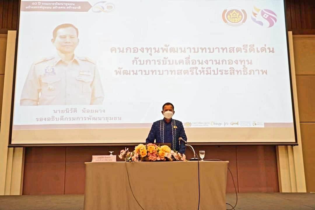 ?นายนิวัติ น้อยผาง รองอธิบดีกรมการพัฒนาชุมชน เป็นประธานเปิดโครงการเชิดชูเกียรติคนกองทุนพัฒนาบทบาทสตรี ประจำปี 2565 กิจกรรมที่ 3 เชิดชูเกียรติคนกองทุนพัฒนาบทบาทสตรีดีเด่น มีวัตถุประสงค์เพื่อยกย่องและเชิดชูเกียรติคนกองทุนพัฒนาบทบาทสตรีดีเด่นที่มีผลการปฏิบัติงานที่มีประสิทธิภาพ สามารถเป็นแบบอย่างได้ รวมถึงสร้างขวัญกำลังใจแก่ผู้ปฏิบัติงานกองทุนพัฒนาบทบาทสตรีในพื้นที่และเป็นการส่งเสริม สนับสนุนให้สตรีได้เข้ามามีส่วนร่วมในการดำเนินงานกองทุนพัฒนาบทบาทสตรี ประกอบด้วย 3 กิจกรรม ได้แก่ การคัดเลือกคนกองทุนพัฒนาบทบาทสตรีดีเด่นระดับจังหวัด การคัดเลือกคนกองทุนพัฒนาบทบาทสตรีดีเด่นระดับเขตตรวจราชการ และการเชิดชูเกียรติคนกองทุนพัฒนาบทบาทสตรีดีเด่น โดยมีการคัดเลือกคนกองทุนพัฒนาบทบาทสตรีดีเด่นระดับเขตตรวจราชการ จำนวน 3 ประเภทคือ สำนักงานเลขานุการคณะอนุกรรมการกลั่นกรองและติดตามการดำเนินงานกองทุนพัฒนาบทบาทสตรีอำเภอดีเด่น ระดับเขตตรวจราชการ จำนวน 18 รางวัล คณะทำงานขับเคลื่อนกองทุนพัฒนาบทบาทสตรีตำบล/เทศบาล/เมืองพัทยา/เขตดีเด่น ระดับเขตตรวจราชการ จำนวน 18 รางวัล และกลุ่มอาชีพสมาชิกกองทุนพัฒนาบทบาทสตรีดีเด่นระดับเขตตรวจราชการ จำนวน 18 รางวัล