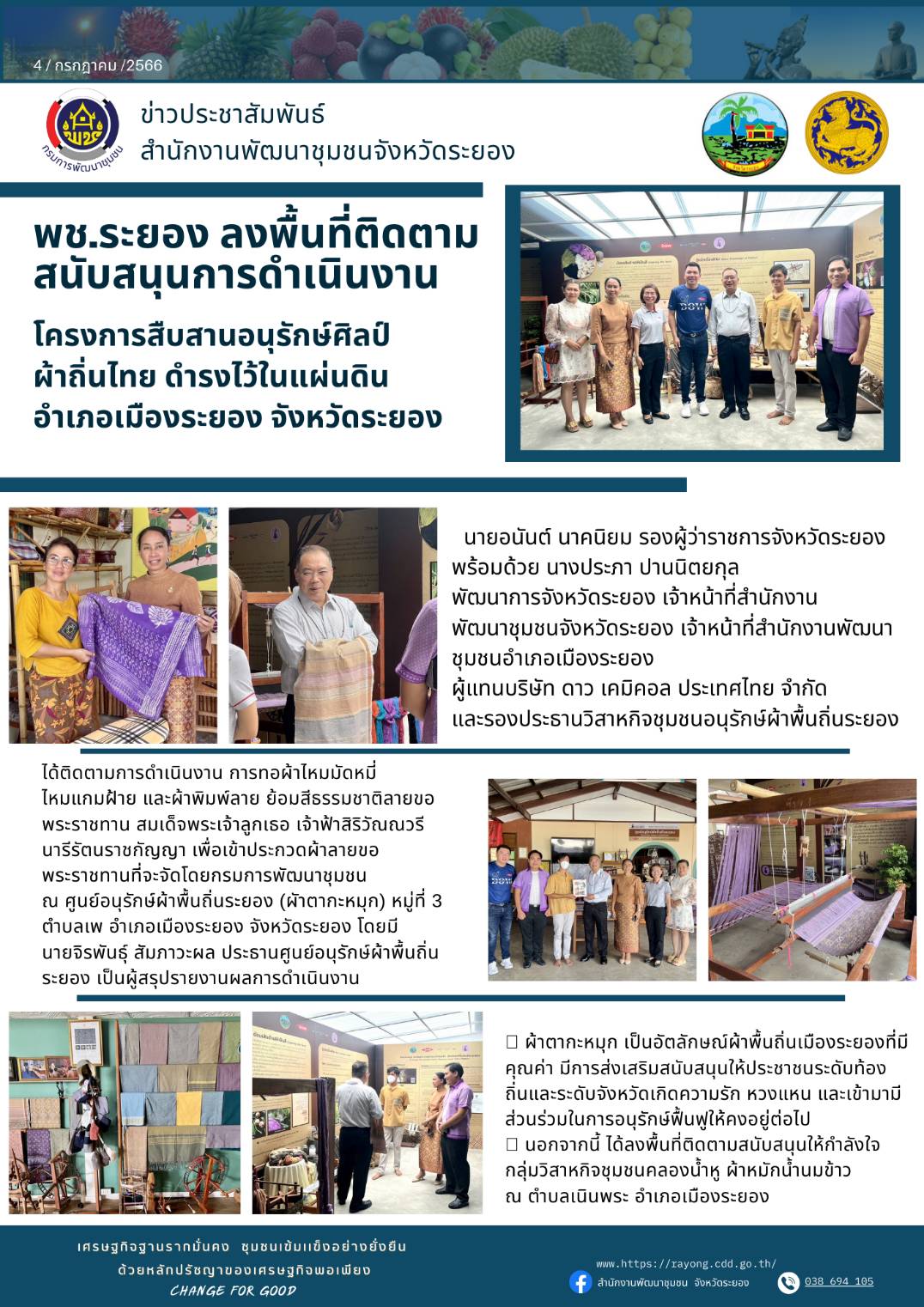 ?? นายอนันต์ นาคนิยม รองผู้ว่าราชการจังหวัดระยอง พร้อมด้วย นางประภา ปานนิตยกุล พัฒนาการจังหวัดระยอง เจ้าหน้าที่สำนักงานพัฒนาชุมชนจังหวัดระยอง เจ้าหน้าที่สำนักงานพัฒนาชุมชนอำเภอเมืองระยอง ผู้แทนบริษัท ดาว เคมิคอล ประเทศไทย จำกัด และรองประธานวิสาหกิจชุมชนอนุรักษ์ผ้าพื้นถิ่นระยอง ได้ติดตามการดำเนินงาน การทอผ้าไหมมัดหมี่ ไหมแกมฝ้าย และผ้าพิมพ์ลาย ย้อมสีธรรมชาติลายขอพระราชทาน สมเด็จพระเจ้าลูกเธอ เจ้าฟ้าสิริวัณณวรี นารีรัตนราชกัญญา เพื่อเข้าประกวดผ้าลายขอพระราชทานที่จะจัดโดยกรมการพัฒนาชุมชน ประมาณปลายเดือนสิงหาคม 2566 โดยมีนายจิรพันธุ์ สัมภาวะผล ประธานศูนย์อนุรักษ์ผ้าพื้นถิ่นระยอง เป็นผู้สรุปรายงานผลการดำเนินงาน
