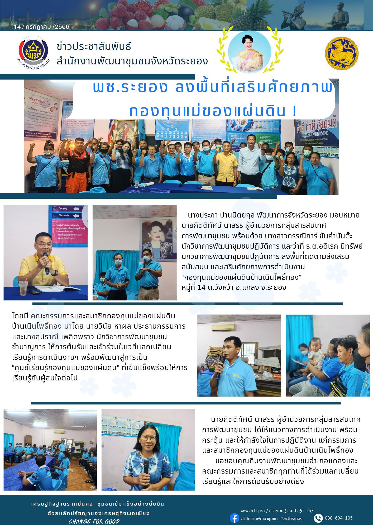 วันศุกร์ที่ 14 กรกฎาคม พ.ศ. 2566 เวลา 13.00 น. ณ กองทุนแม่ของแผ่นดินบ้านเนินโพธิ์ทอง หมู่ที่ 14 ต.วังหว้า อ.แกลง จ.ระยอง