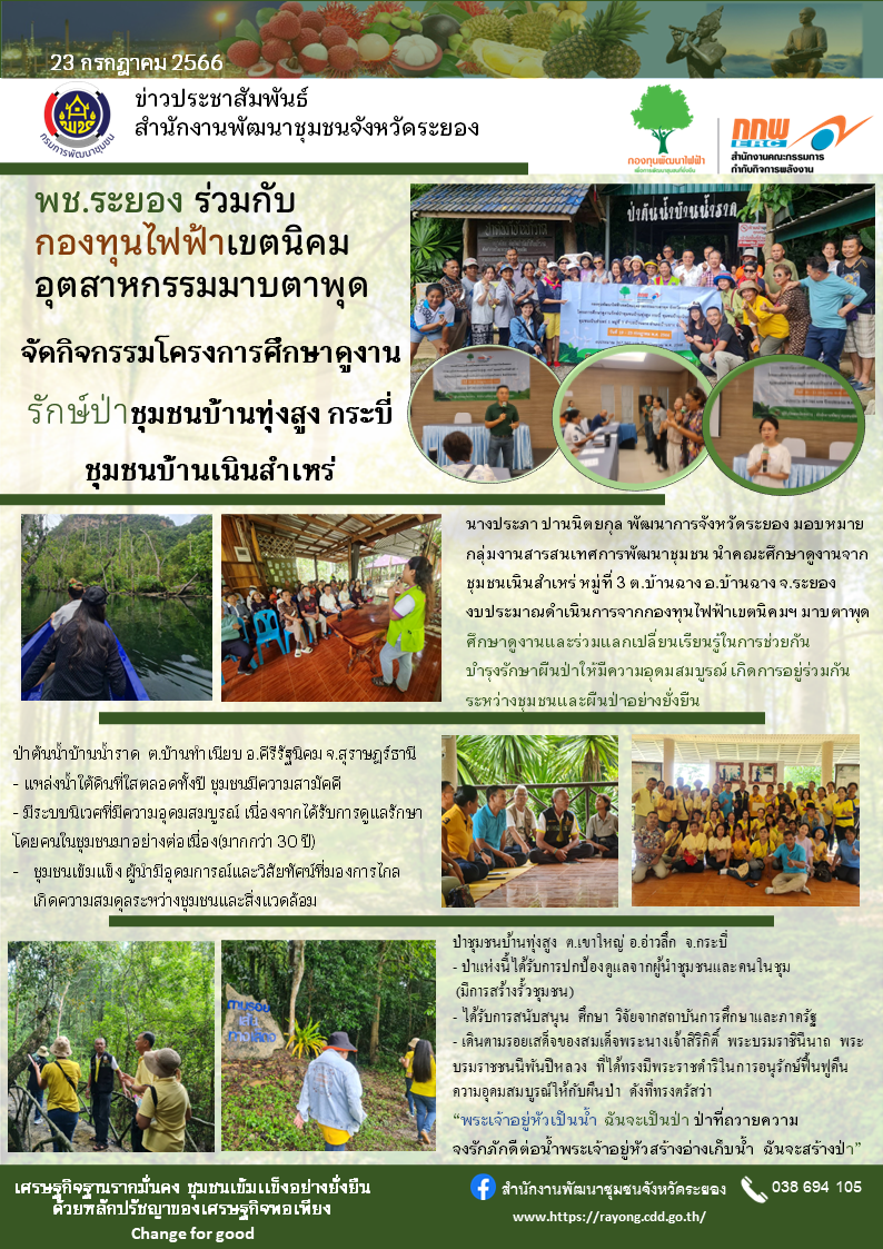 พช.ระยอง ร่วมกับ กองทุนไฟฟ้าเขตนิคมอุตสาหกรรมมาบตาพุด จัดกิจกรรมโครงการศึกษาดูงานรักษ์ป่าชุมชนบ้านทุ่งสูง กระบี่ ชุมชนบ้านเนินสำเหร่