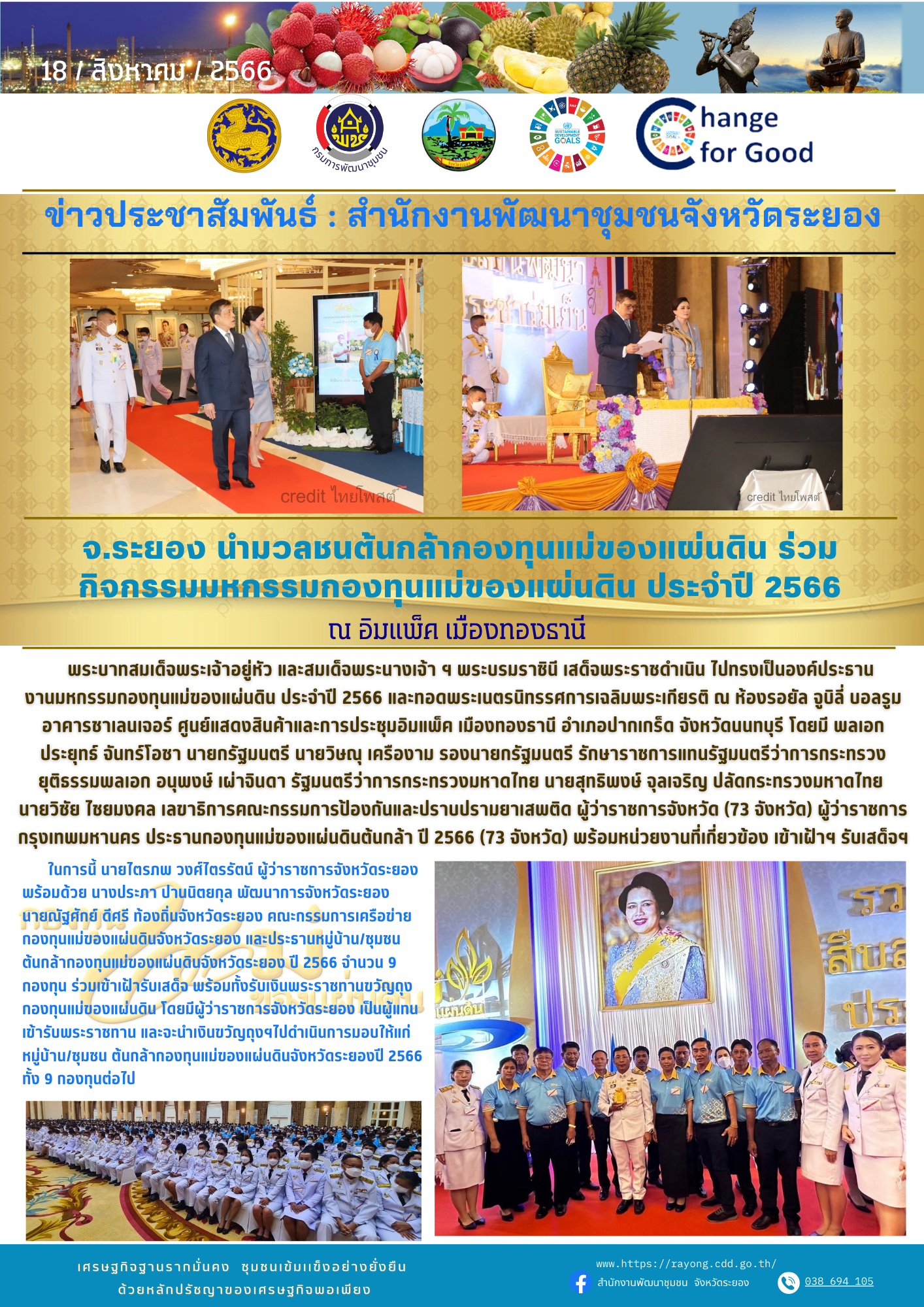 จังหวัดระยอง นำมวลชนต้นกล้ากองทุนแม่ของแผ่นดิน ปี 2566 เข้าร่วมกิจกรรมมหกรรมกองทุนแม่ของแผ่นดิน ประจำปี 2566 ณ อิมแพ็ค เมืองทองธานี