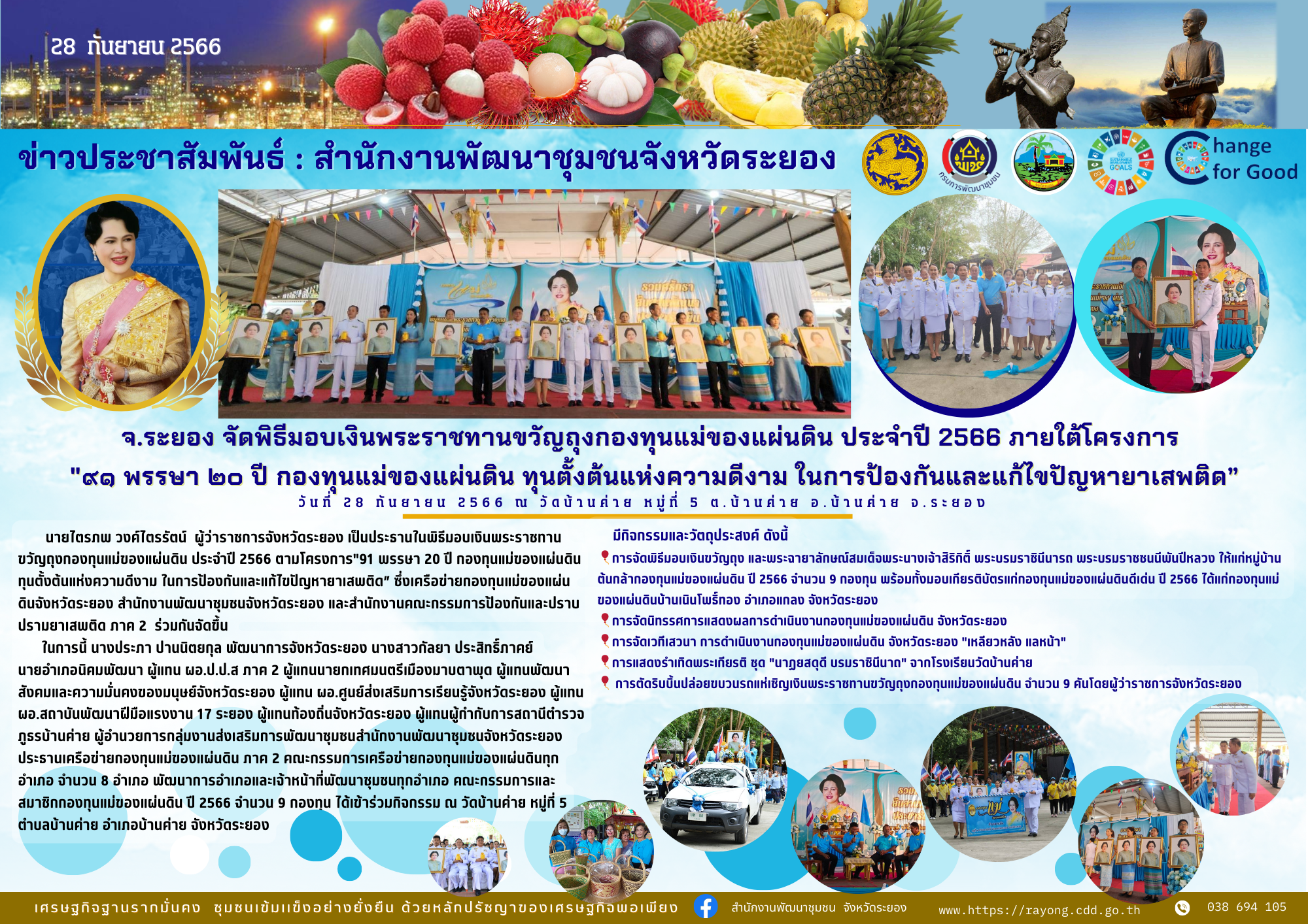 🎈การจัดพิธีมอบเงินขวัญถุง และพระฉายาลักษณ์สมเด็จพระนางเจ้าสิริกิติ์ พระบรมราชินีนารถ พระบรมราชชนนีพันปีหลวง ให้แก่หมู่บ้านต้นกล้ากองทุนแม่ของแผ่นดิน ปี 2566 จำนวน 9 กองทุน พร้อมทั้งมอบเกียรติบัตรแก่กองทุนแม่ของแผ่นดินดีเด่น ปี 2566 ได้แก่กองทุนแม่ของแผ่นดินบ้านเนินโพธิ์ทอง อำเภอแกลง จังหวัดระยอง