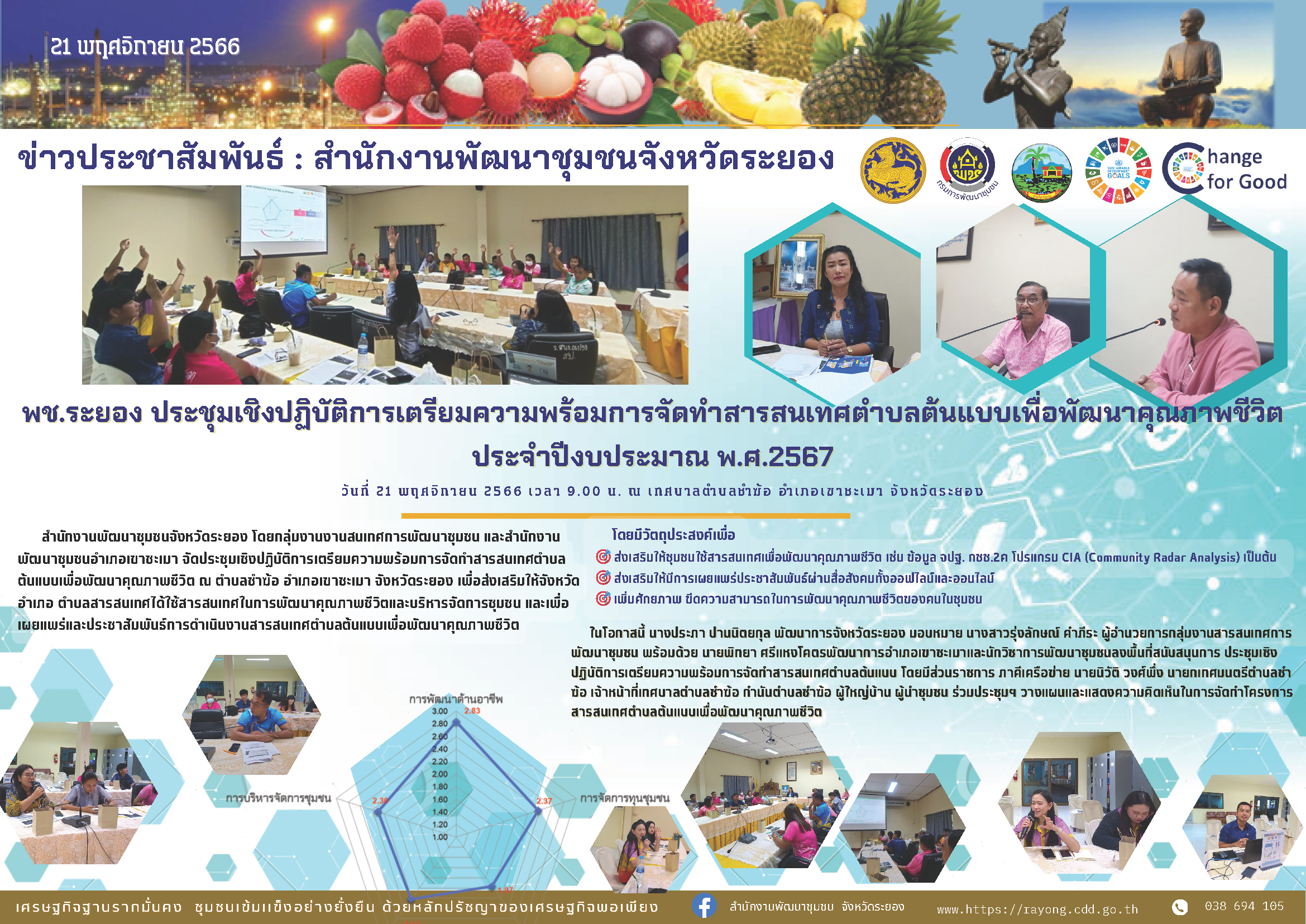 🎯 สำนักงานพัฒนาชุมชนจังหวัดระยอง โดยกลุ่มงานงานสนเทศการพัฒนาชุมชน และสำนักงานพัฒนาชุมชนอำเภอเขาชะเมา จัดประชุมเชิงปฏิบัติการเตรียมความพร้อมการจัดทำสารสนเทศตำบลต้นแบบเพื่อพัฒนาคุณภาพชีวิต ณ ตำบลชำฆ้อ อำเภอเขาชะเมา จังหวัดระยอง เพื่อส่งเสริมให้จังหวัด อำเภอ ตำบลสารสนเทศได้ใช้สารสนเทศในการพัฒนาคุณภาพชีวิตและบริหารจัดการชุมชน และเพื่อเผยแพร่และประชาสัมพันธ์การดำเนินงานสารสนเทศตำบลต้นแบบเพื่อพัฒนาคุณภาพชีวิต