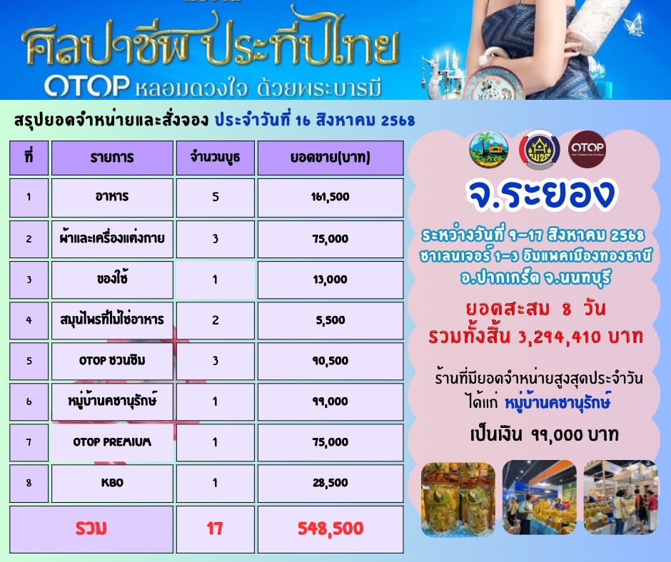 🎯วันที่ 16 สิงหาคม 2568 ยอดจำหน่ายรวม 548,500 บาท รายละเอียด ดังนี้