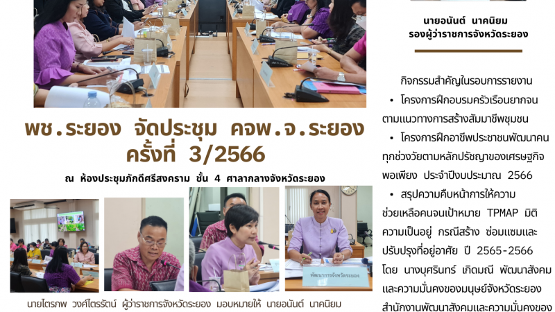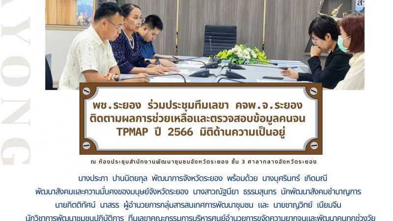 ข่าวประชาสัมพันธ์ พช.ระยอง ร่วมประชุมทีมเลขา คจพ.จ.ระยอง ติดตามผลการช่วยเหลือและตรวจสอบข้อมูลคนจน TPMAP ปี 2566 มิติด้านความเป็นอยู่ 13 กรกฎาคม 2566 / 18:50 น.
