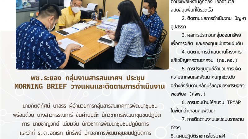 ข่าวประชาสัมพันธ์ พช.ระยอง กลุ่มงานสารสนเทศฯ ประชุม Morning Brief วางแผนและติดตามการดำเนินงาน 15 กรกฎาคม 2566 / 08:57 น.