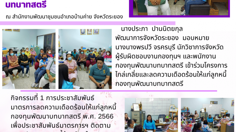 ข่าวประชาสัมพันธ์ พช.ระยอง เข้าร่วมโครงการไกล่เกลี่ยและลดความเดือดร้อนให้แก่ลูกหนี้กองทุนพัฒนาบทบาทสตรี 15 กรกฎาคม 2566 / 15:50 น.