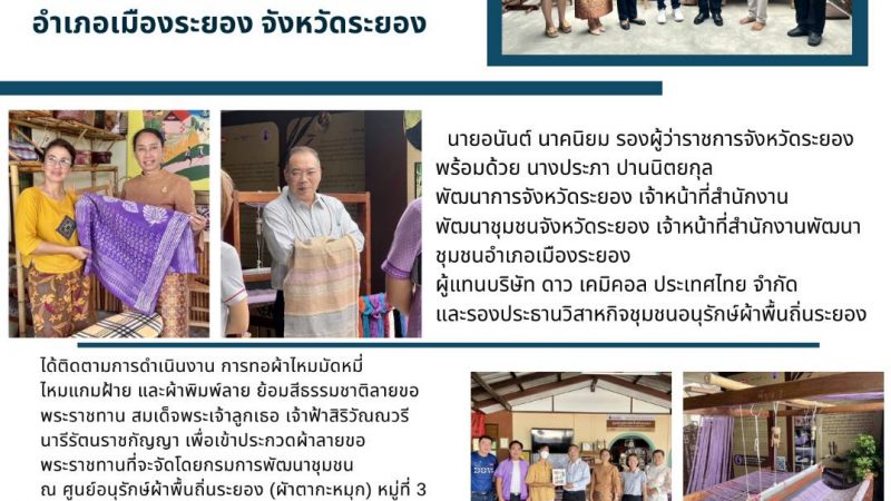 ข่าวประชาสัมพันธ์ พช.ระยอง ลงพื้นที่ติดตาม สนับสนุนการดำเนินงานโครงการสืบสานอนุรักษ์ศิลป์ผ้าถิ่นไทย ดำรงไว้ในแผ่นดิน อำเภอเมืองระยอง จังหวัดระยอง 05 กรกฎาคม 2566 / 08:42 น.