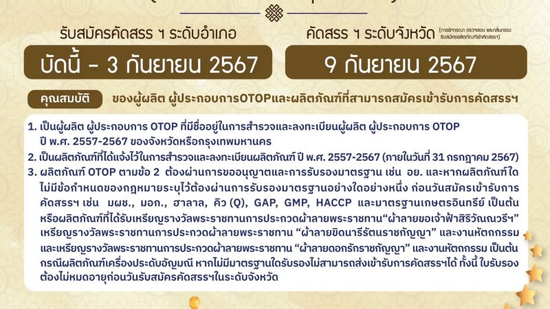 ข่าวประชาสัมพันธ์ 📣📢จังหวัดระยองขอเชิญชวนผู้ผลิต ผู้ประกอบการ OTOP ส่งผลิตภัณฑ์เข้าร่วมคัดสรรสุดยอดหนึ่งตำบล หนึ่งผลิตภัณฑ์ไทยปี 2567 27 สิงหาคม 2567 / 09:42 น.