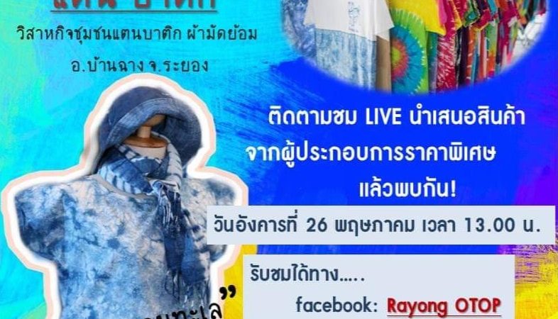ข่าวประชาสัมพันธ์ “พช.จังหวัดระยอง Live สด Facebook ผลิตภัณฑ์จากผ้ามัดย้อมจากวิสาหกิจชุมชนแตนบาติก อ.บ้านฉาง” 26 พฤษภาคม 2563 / 17:21 น.