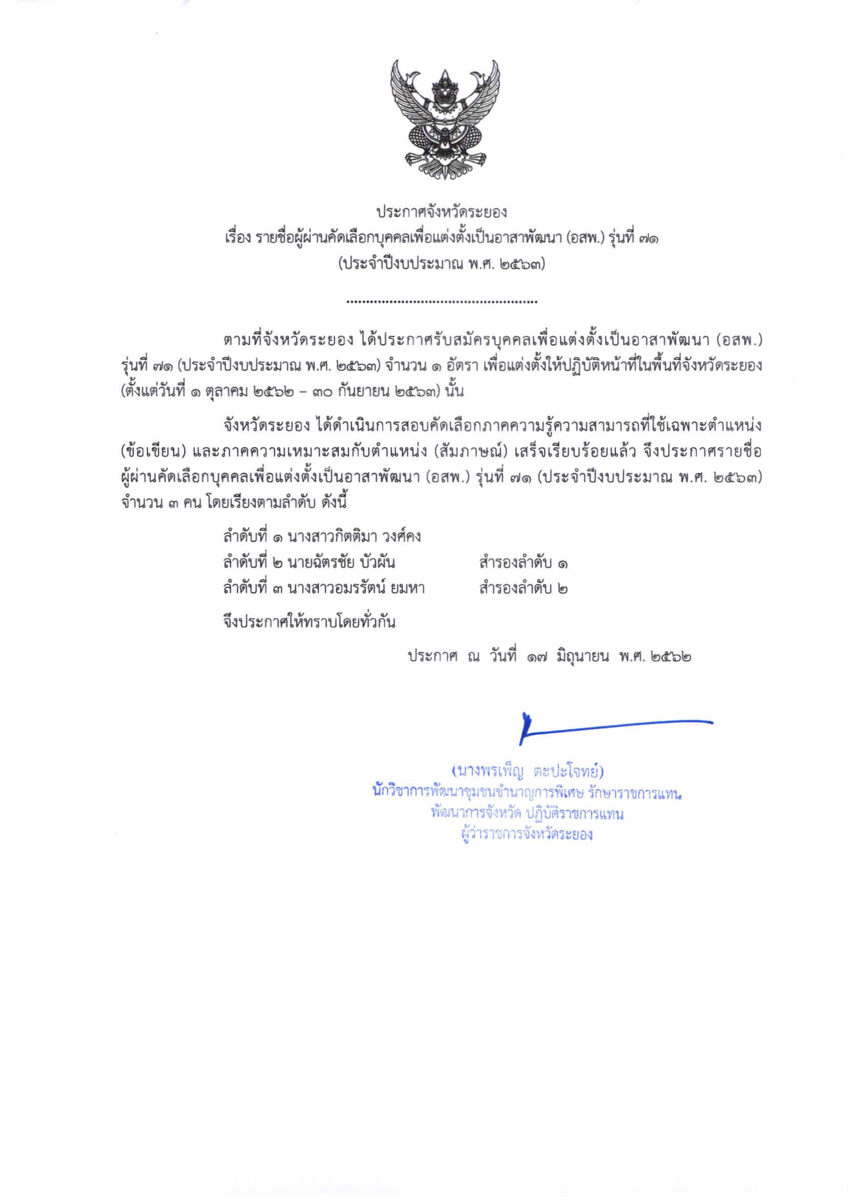 รายชื่อผู้ผ่านคัดเลือกบุคคลเพื่อแต่งตั้งเป็นอาสาพัฒนา (อสพ.) รุ่นที่ 71 (ประจำปีงบประมาณ พ.ศ. 2563)